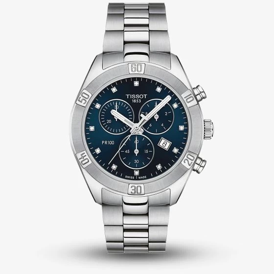The Tissot T101.917.11.046.00 PR 100 watch combines a 38mm round shaped stainless steel case and bracelet with a double push button deployment clasp. It has a blue analogue dial with chronograph sub-dials, a date display and luminescent hands, all of which is protected beneath scratch resistant sapphire crystal glass. Power is generated by the Swiss made Calibre 10 1/2″‘ quartz movement with 6 jewels and an end of life indicator. This model also has 12 Top Wesselton diamonds graded as VS-SI clarity totalling 0.0456 carat, as well as a water resistance of up to 100 metres.