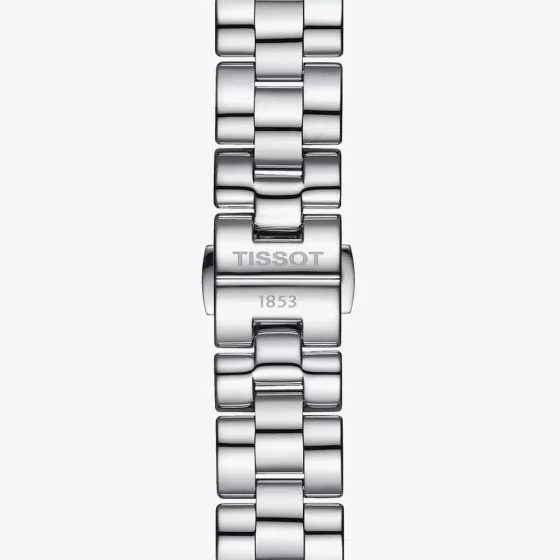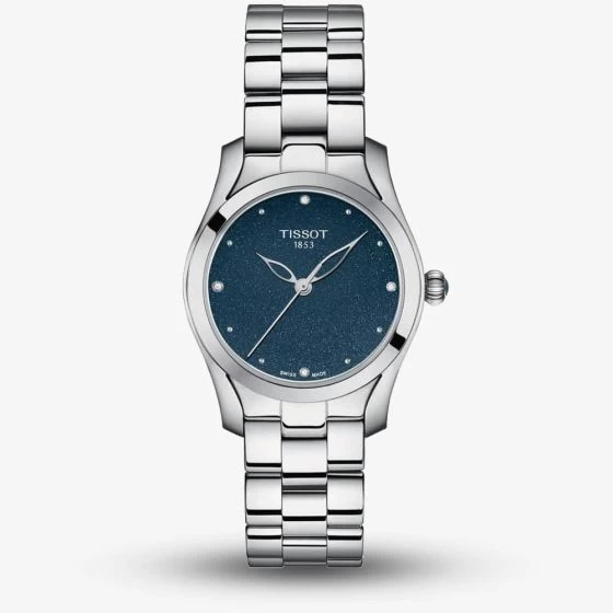 Tissot Ladies T-Wave Diamond Watch T112.210.11.046.00 combines a 30mm round-shaped stainless-steel case and silver stainless-steel bracelet with a push button deployment clasp. It has a blue analogue dial with two silver hands, resembling skeletonised leaves and a second tracker, which is protected beneath a domed scratch-resistant sapphire crystal glass. This beautiful watch features 4 single cut diamonds with a total weight of 0.01ct. Colour: Top Wesselton. Clarity: VS-SI. Power is generated by Swiss quartz movement with an end-of-life indicator. This model also has a water resistance of up to 30 metres.