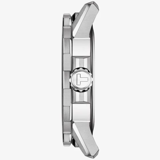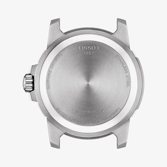 The Tissot T125.610.11.051.00 watch combines a 44mm round shaped stainless-steel case and silver stainless-steel bracelet with a fold over clasp. It has a black analogue dial with two luminescent silver hands with a second tracker. The date is visible at position 3 with a silver border which is protected beneath sapphire crystal glass. Power is generated by the quartz movement. This model also has a water resistance of up to 100 metres.