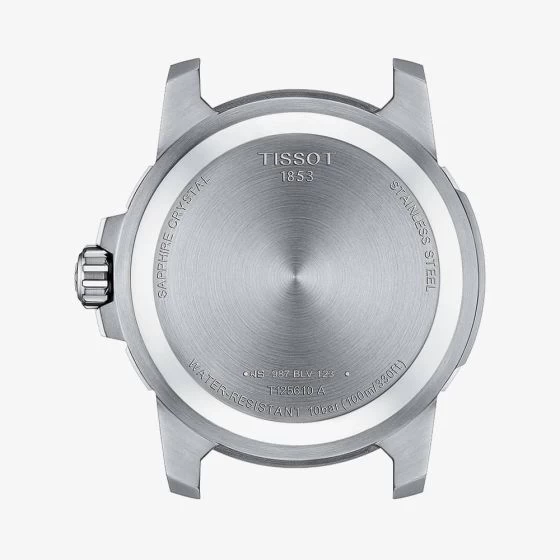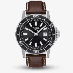 The Tissot T125.610.16.051.00 watch combines a 44mm round shaped stainless-steel case and brown leather strap with a traditional buckle. It has a black analogue dial with two silver luminescent hands with a second tracker. The date is visible at position 3 with a silver border which is protected beneath sapphire crystal glass. Power is generated by the quartz movement. This model also has a water resistance of up to 100 metres.