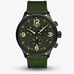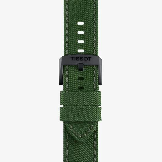 From Tissot’s T-Sport collection, an eye catching design crafted with a hard wearing stainless steel and black PVD case featuring a green chronograph dial with luminous hands and indexes which are protected by a scratch resistant Sapphire Crystal glass. Additionally this model is powered by a Swiss quartz movement, features stopwatch functionality, large 45mm dial and is finished with a green fabric strap that complements it perfectly.