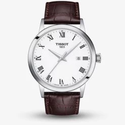 From Tissot’s T-Classic collection, an elegant design crafted with a hard wearing stainless steel case featuring a white dial along with silver coloured hands and black roman numerals which are protected by a scratch resistant Sapphire Crystal glass. Additionally this model is powered by a Swiss quartz movement and is finished with a brown leather strap which complements it perfectly.
