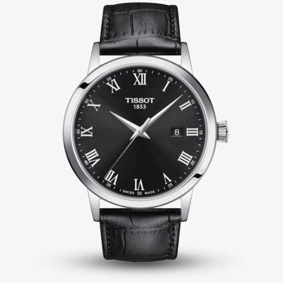From Tissot’s T-Classic collection, an elegant design crafted with a hard wearing stainless steel case featuring a black dial along with silver coloured hands and roman numerals which are protected by a scratch resistant Sapphire Crystal glass. Additionally this model is powered by a Swiss quartz movement and is finished with a black leather strap which complements it perfectly.