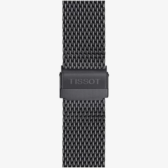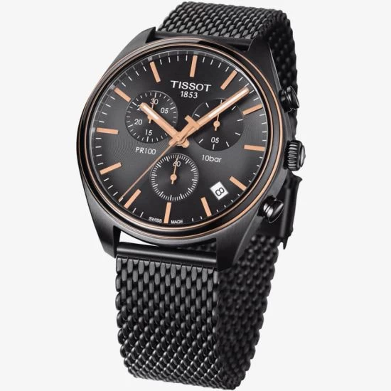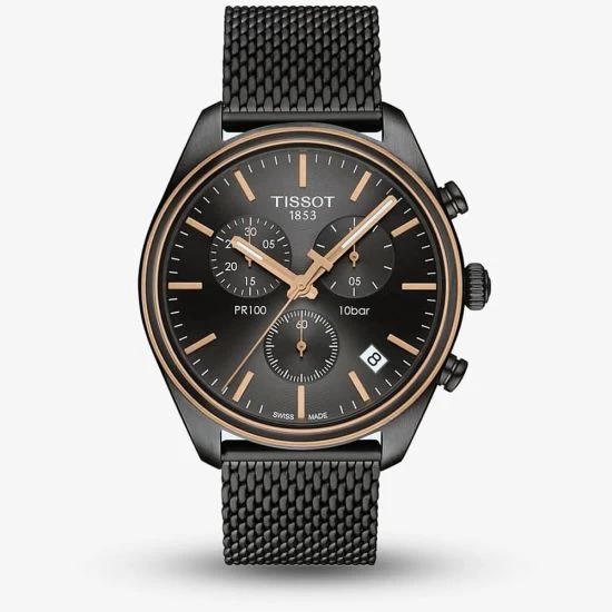 From the PR100 collection, Tissot have crafted this eye catching design with a gun metal PVD case with contrasting rose gold PVD indexes and hands, chronograph function with date display between 4 and 5 o’clock finished with a complementing gun metal PVD mesh bracelet.