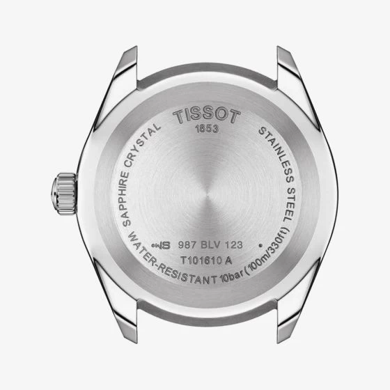 The Tissot T101.610.11.051.00 PR100 Sport watch from the T-Classic collection combines a stainless steel case and bracelet with a double push button clasp. It has luminescent hands and a date display which are protected beneath domed scratch resistant sapphire crystal glass. Powering the watch is a Swiss quartz movement with 3 jewels and an end of life indicator. This model also has a water resistance of up to 100 metres (330 ft/10 bar of pressure) and weighs 155 grams.