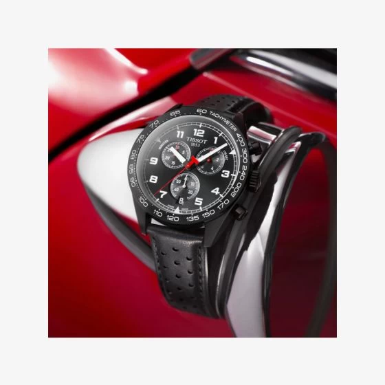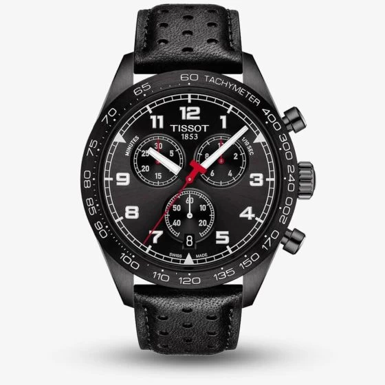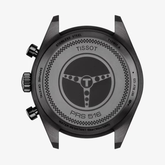 The Tissot T131.617.36.052.00 T-Sport PRS 516 watch is inspired by classic motorsport cars and the chronograph push buttons are modelled after engine pistons. It combines a 45mm round shaped black PVD coated stainless steel case and black perforated leather strap with a butterfly clasp and push buttons. It has a black analogue dial with luminescent hands, a date display, and chronograph sub-dials, all of which is protected beneath scratch resistant sapphire crystal glass. Power is generated by the Swiss made Calibre 13 ¼’” quartz movement with 4 jewels and an end of life indicator. This model also has a water resistance of up to 100 metres (330ft / 10 bar pressure).