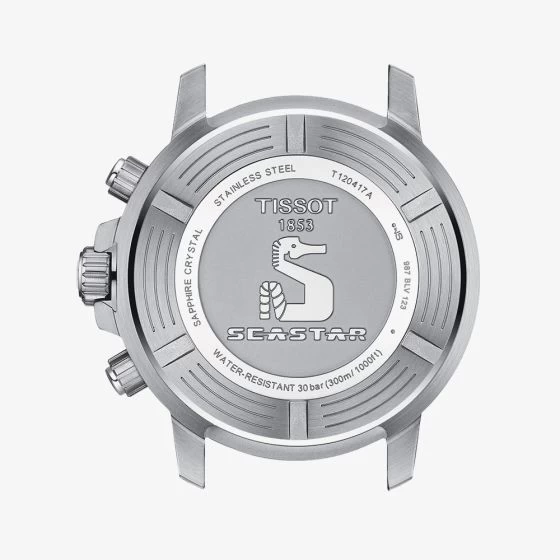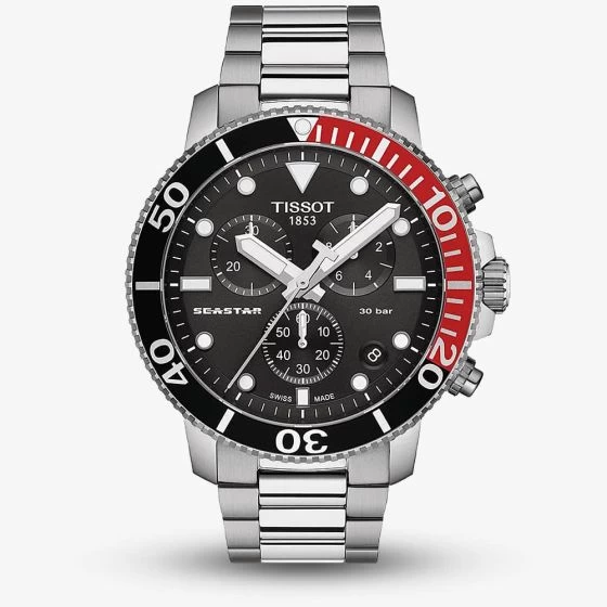 The Tissot Mens Seastar Black & Red Chronograph T120.417.11.051.01 watch combines a 45mm round shaped stainless steel case and silver stainless steel bracelet with a fold over clasp. It has a black analogue dial with luminescent hands, date display which is protected beneath scratch resistant sapphire crystal glass. Power is generated by the quartz movement. This model also has a water resistance of up to 300 metres.