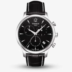 This mens round dial watch by Tissot is a watch that will bring a touch of class to your style. The black multi dial combines elegantly with the black leather strap. The dial also features chronograph and date function.
