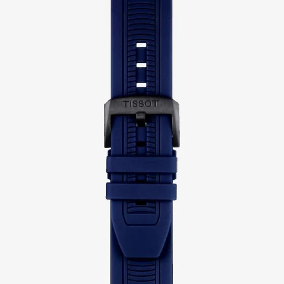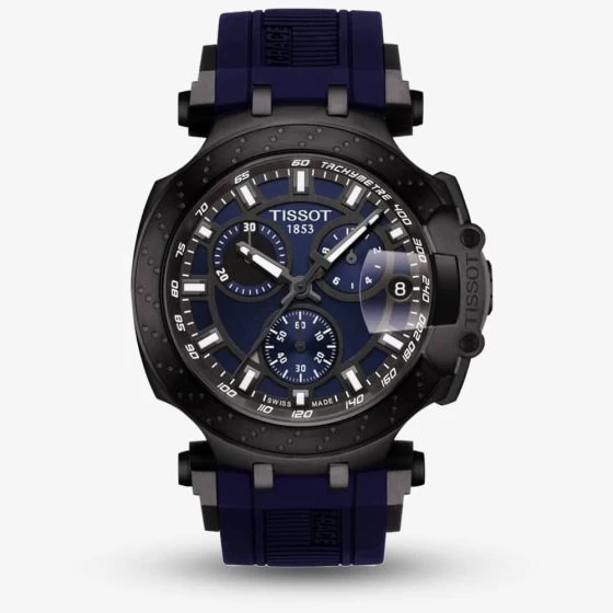 Part of the T-Race collection, this diverse sports watch features an eye catching black dial with a blue chronograph sub dial. The dial also features a date window at 3 o’clock with luminescent black hands and indexes. Finished with a PVD black and grey plated case, the watch boasts a contrasting tachymetre. The watch is completed with a durable blue rubber strap and a traditional buckle fastening.
