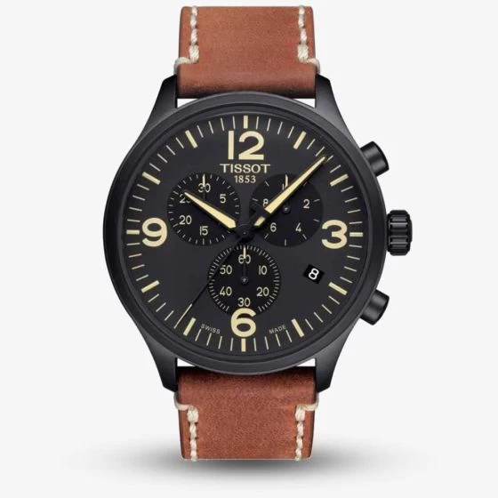Introducing the Chrono XL from Tissot and the T-Sport range, a stylish masculine timepiece ideal for everyday wear. The tough black steel case is adorned with sapphire crystal glass and houses a round black dial. The large numerals and bold baton hour markers make for an easy read, boasting extra functions such as chronograph sub-dials and a date window. Complete with a comfortable brown leather strap and traditional buckle for a secure fit.
