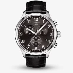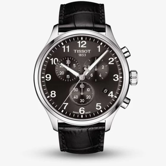 A classic looking mens timepiece which consists of a black dial featuring luminescent hands and hour markers, complete with three chronograph sub dials and a functioning date window. Fastens comfortably using a black genuine leather strap.