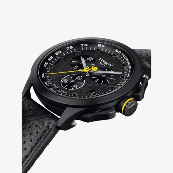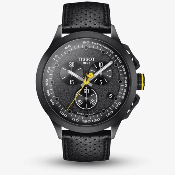 The Tissot Mens Tour De France 22 Black Watch T135.417.37.051.00 watch combines a 45mm round shaped stainless steel with black pvd coating case and black leather strap with a traditional buckle. It has a black analogue dial which is protected beneath anti glare and scratch resistant sapphire crystal glass. Power is generated by the quartz movement. This model also has a water resistance of up to 100 metres. This special edition watch was made for the 2022 Tour De France and has racing bike features on the watch. One of the main feautres is a yellow race bike as the cog for the 3rd hand.