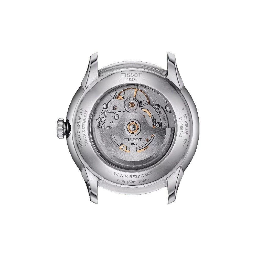 This Tissot watch has a case made of Steel silver with a diameter of 39 mm and is fitted with a Metal strap. Inside the case lies a ETA movement and the watch features a Sapphire crystal.