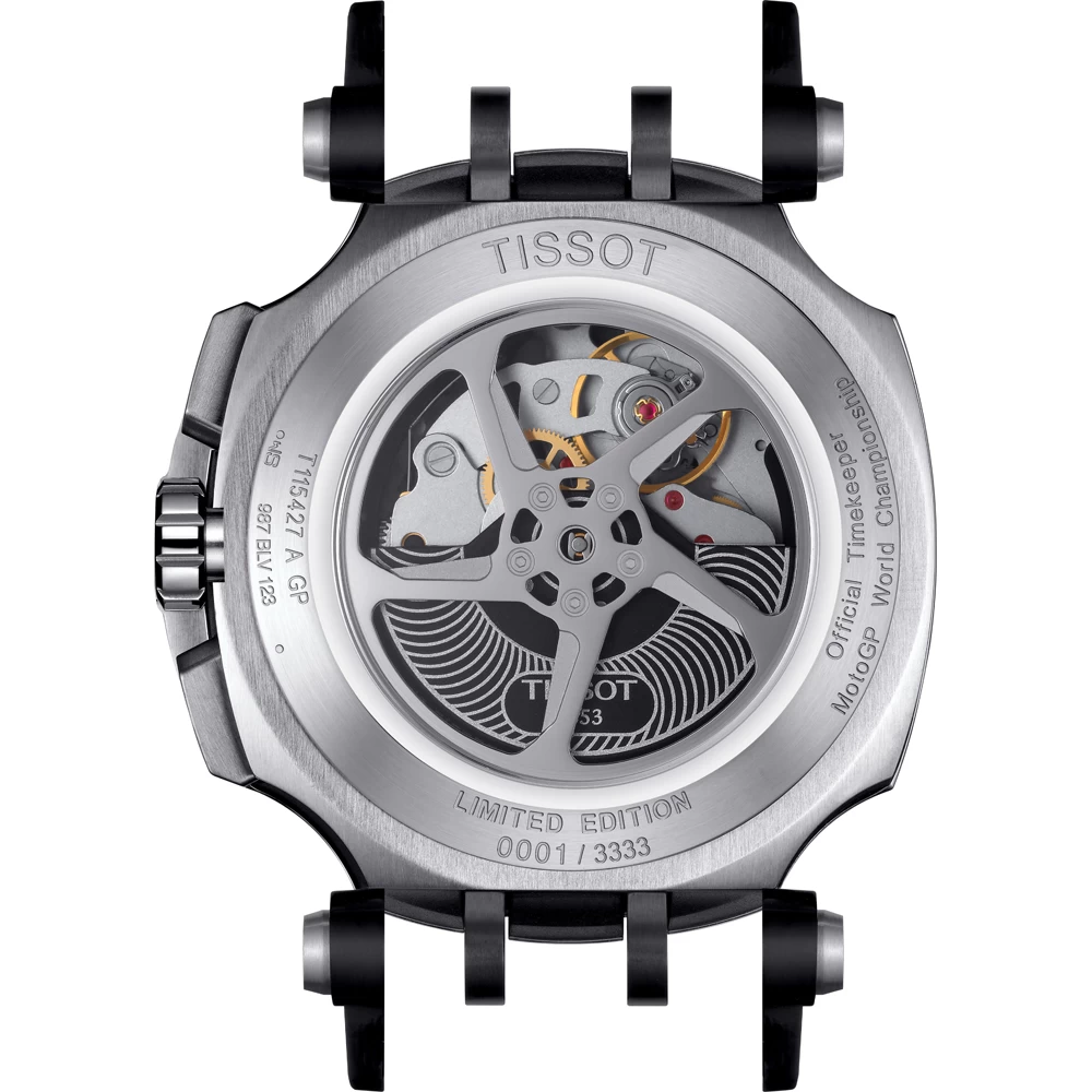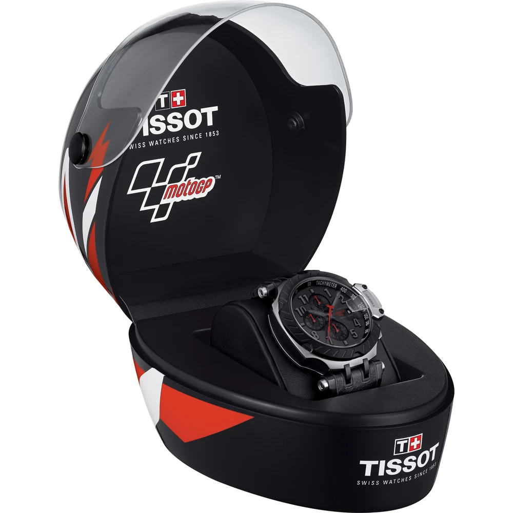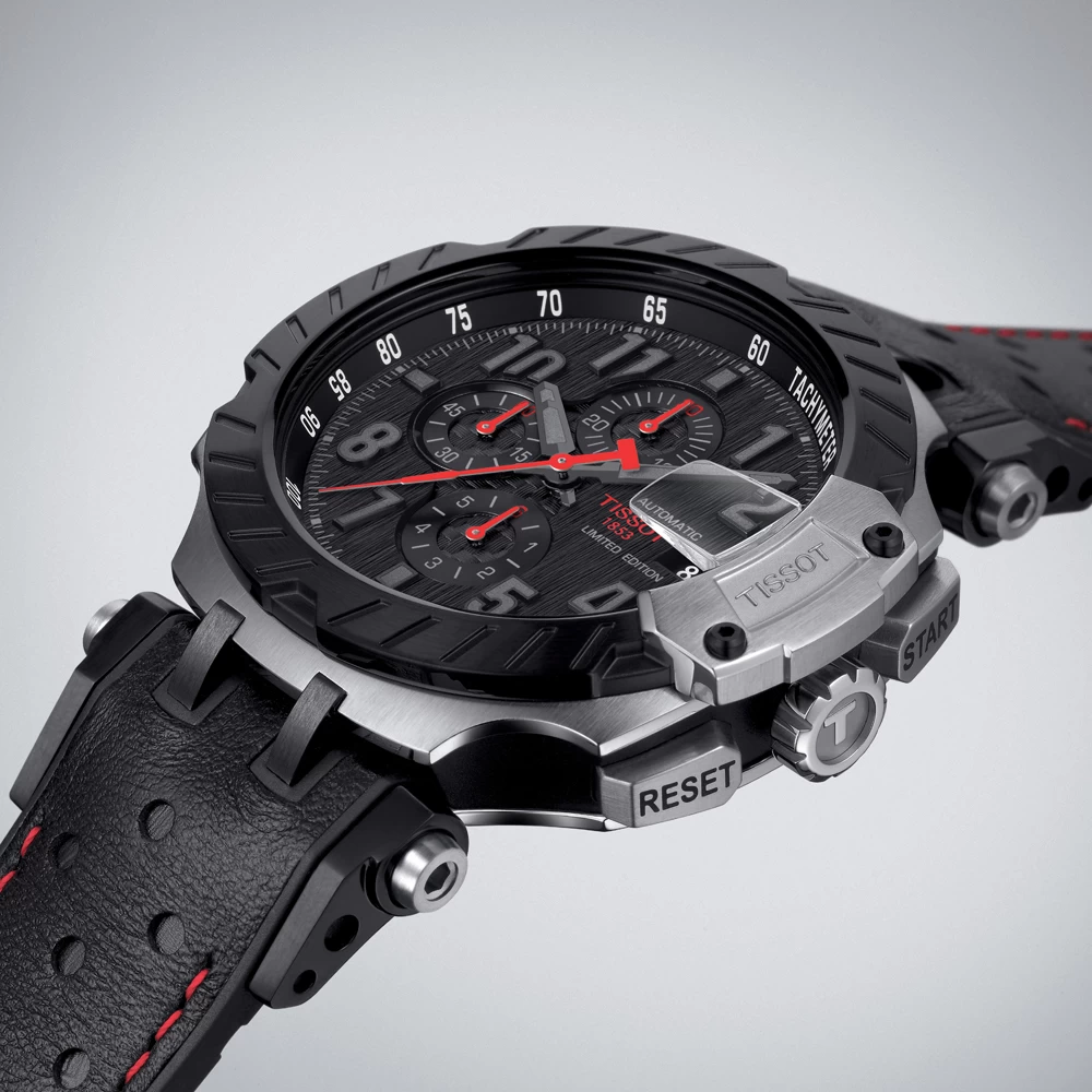 This limited to 3333 numbered watch, is inspired by the design of motorcycles. Most striking is the bezel which is shaped like a disc brake a special full face helmet box the watch comes in. The link with motorsport is also represented in the details; The pushers are engraved with the words Start and Stop, the hour numbers are derived from MotoGP fairings and the seal of the movement under the glass case lid is based on a motorcycle wheel. The perforated leather strap is a classic racing strap.