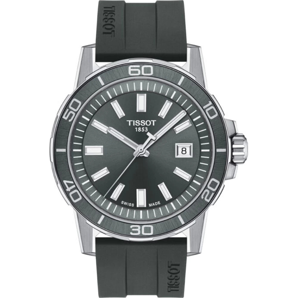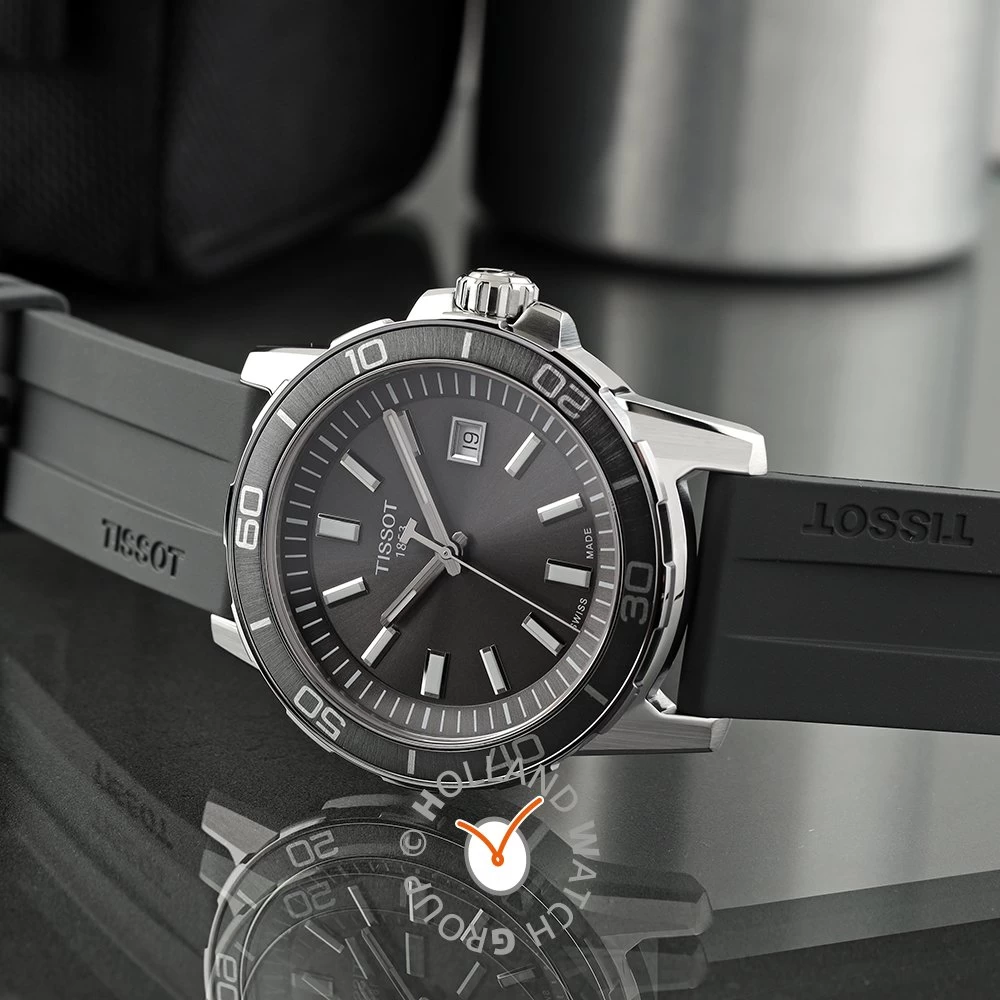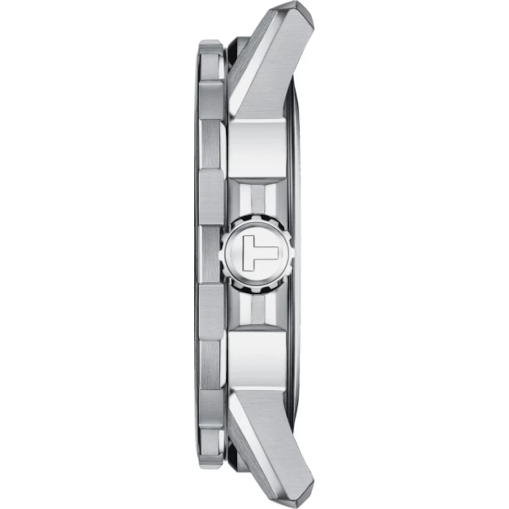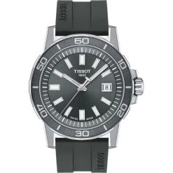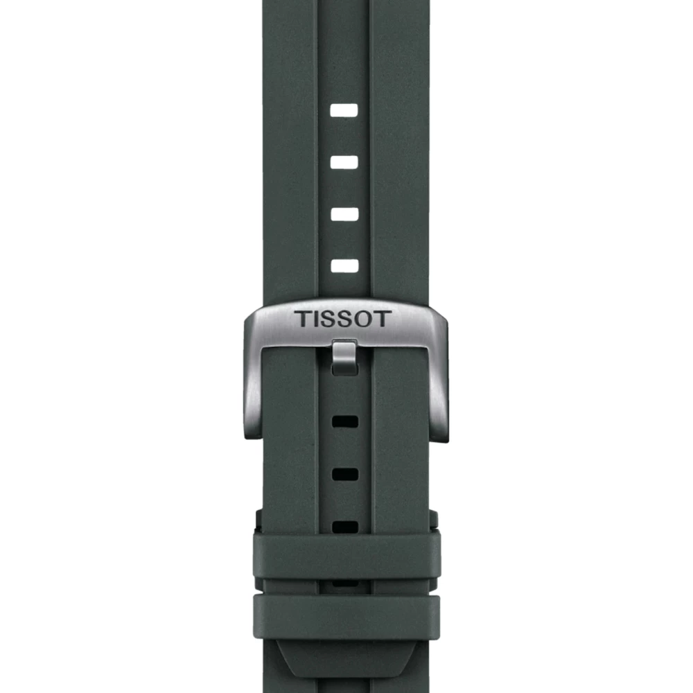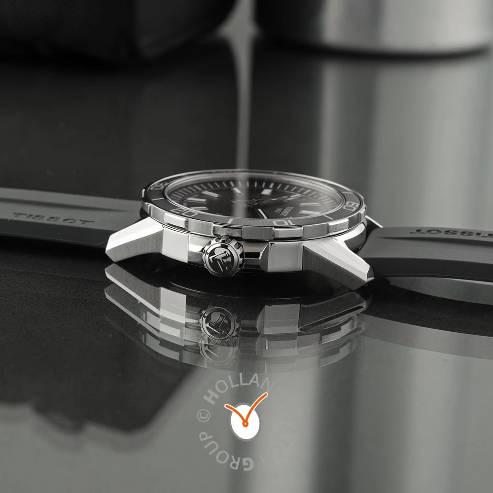 This Tissot watch has a case made of Steel silver with a diameter of 44 mm and is fitted with a rubber strap. Inside the case lies a ETA movement and the watch features a Sapphire crystal.